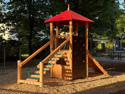 Im hinteren Bereich gibt es ein Kletterhaus, eine Doppelschaukel und Reck.